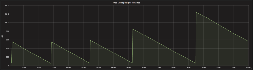 Figure 2. Graph showing the free disk space for an instance with autoscaling local storage turned on. Whenever the free disk space drops below our minimum threshold, we request another disk volume and attach it to the instance. Subsequent requests allocate ever-larger disk volumes until we hit a pre-configured maximum total disk space.