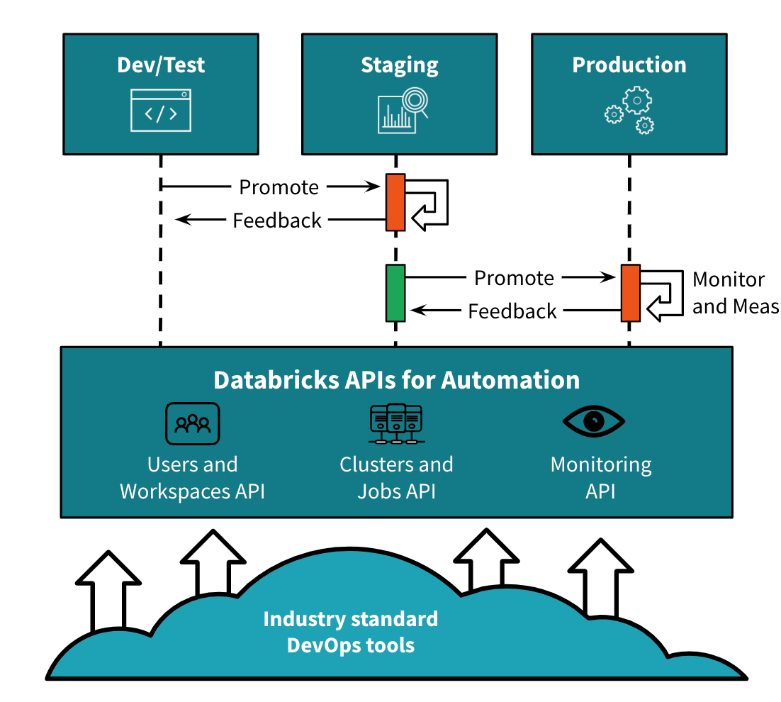 Staging/Integration environment – While hundreds of data scientists and data engineers are working in the development phase in the data environment when the time comes to push a set of changes to the integration testing phase, more control is required. Typically, you want fewer users to have access to the integration testing environment where tests are running continuously and results are being reported and changes are being promoted further. In order to do that, the team requires another workspace to represent their ‘staging’ environment. Another fully configured environment can be delivered very quickly to this team. Integration with popular continuous integration tools such as Jenkins or Azure Devops Services, enables the team to continuously test the changes. With more developers and more workloads, the rate of changes to the code base increases. There is a need to run tests faster. This also requires the underlying infrastructure to be available very quickly. Databricks pools allow the infrastructure to be held in a ready-to-use state while preventing runaway costs for always-on infrastructure. With all this tooling in place, the team is able to realize the ‘Staging’ environment for their continuous integration workflows.